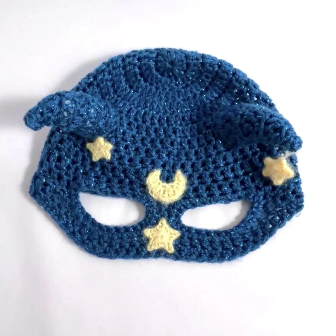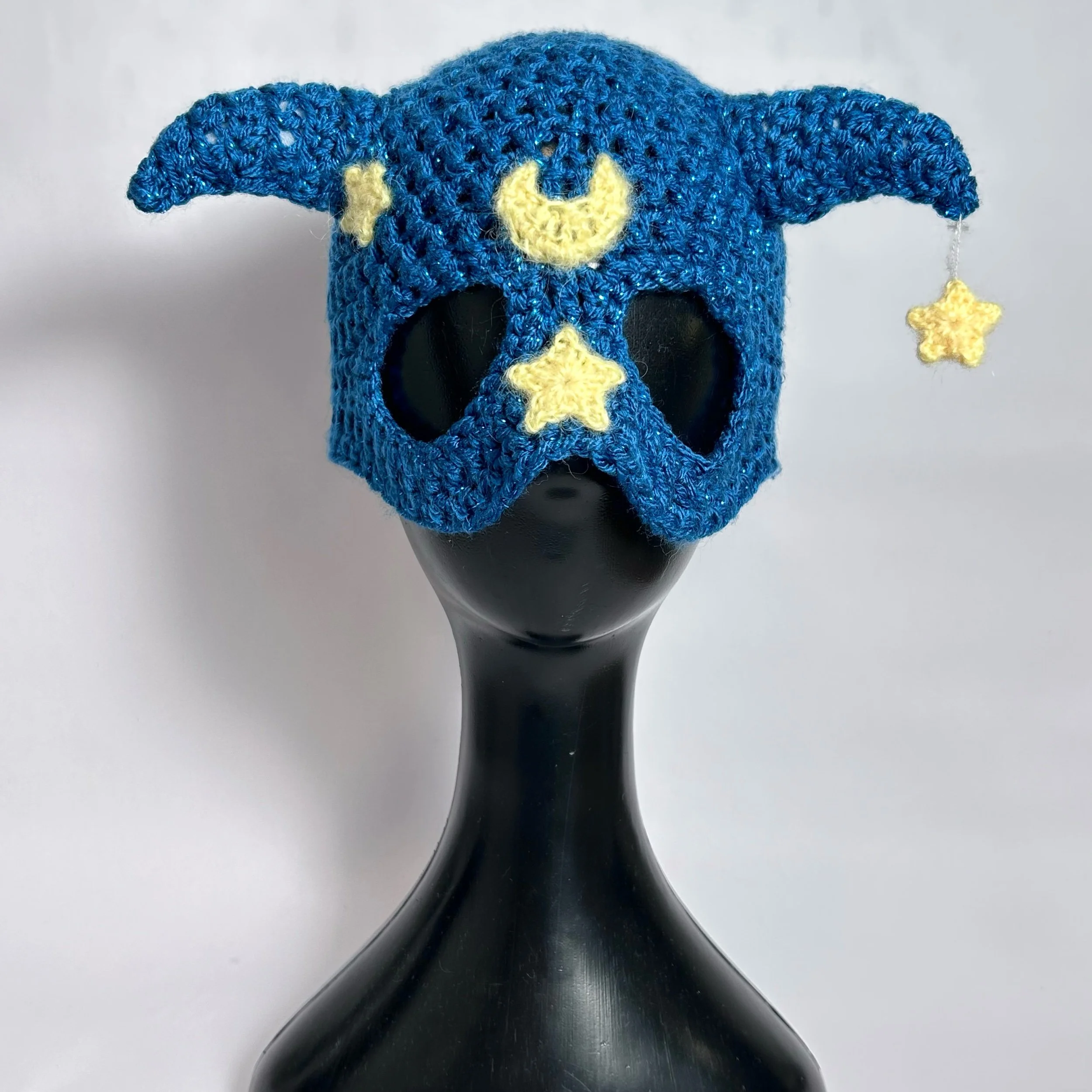 Supplies needed: size 4 medium weight yarn, lace weight mohair yarn (for stars & crescent moon), hook size 5.0mm/5.5mm, hook size 2.25mm, steamer, tapestry needle, scissors, polyfill, styrofoam mannequin head (optional)